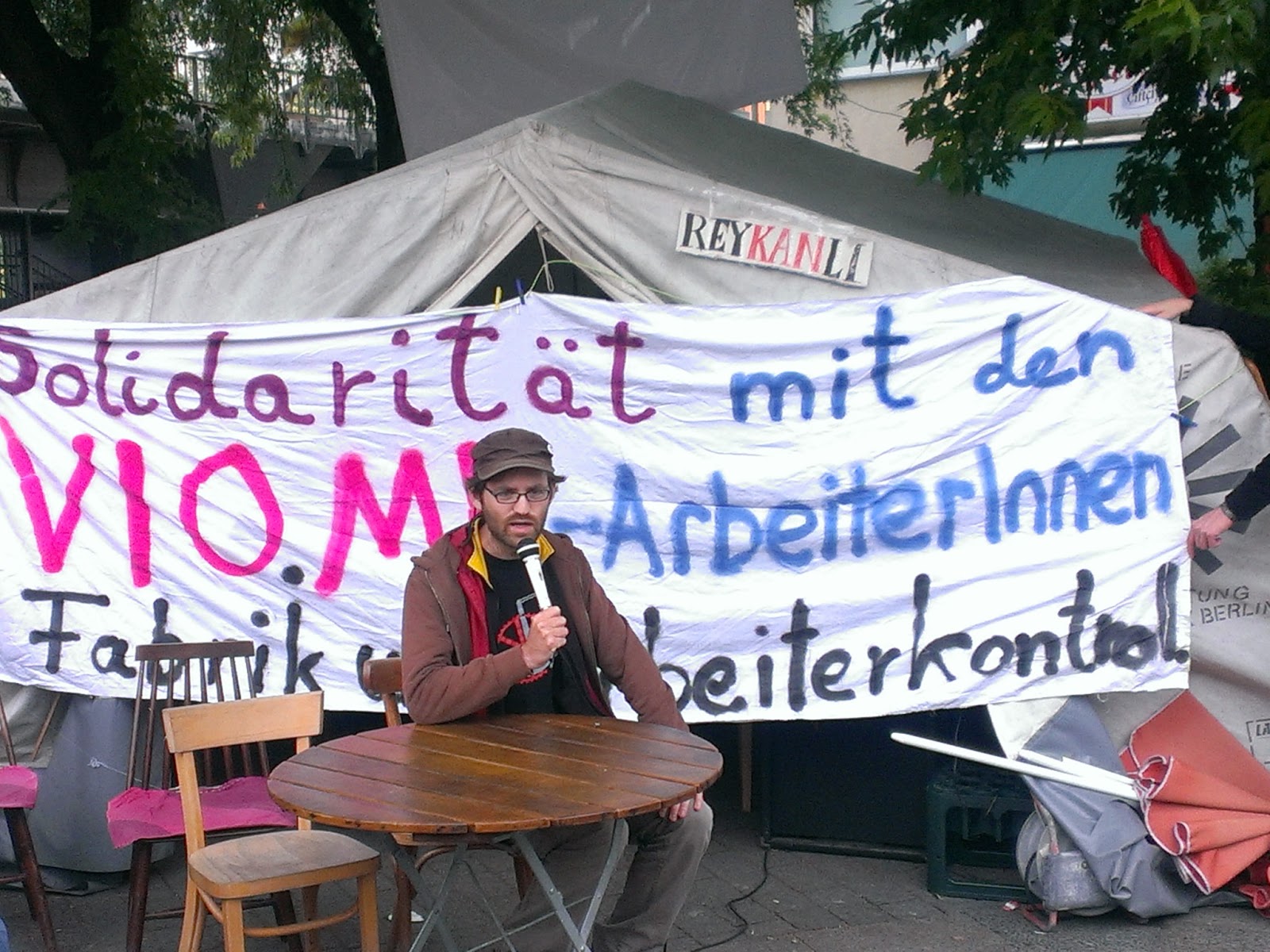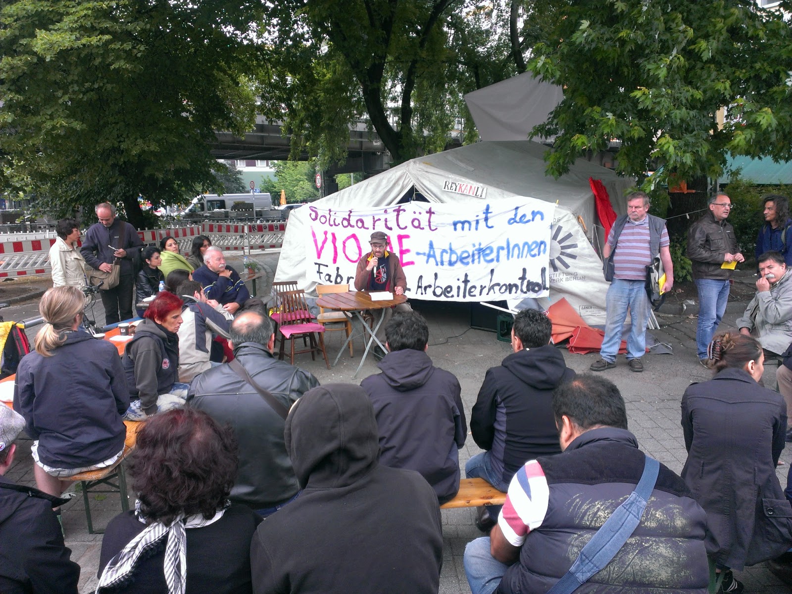 German, Turkish and Greek comrades held a solidarity rally to support the struggle, calling for a united solidarity effort for all the struggles in Southern Europe and worldwide and referencing the example of Vio.Me. as part of a workers’ answer to the current capitalist crisis. A talk about the current situation followed. The banner in the background reads: “Solidarity with the VioMe workers, factory under workers’ control”.